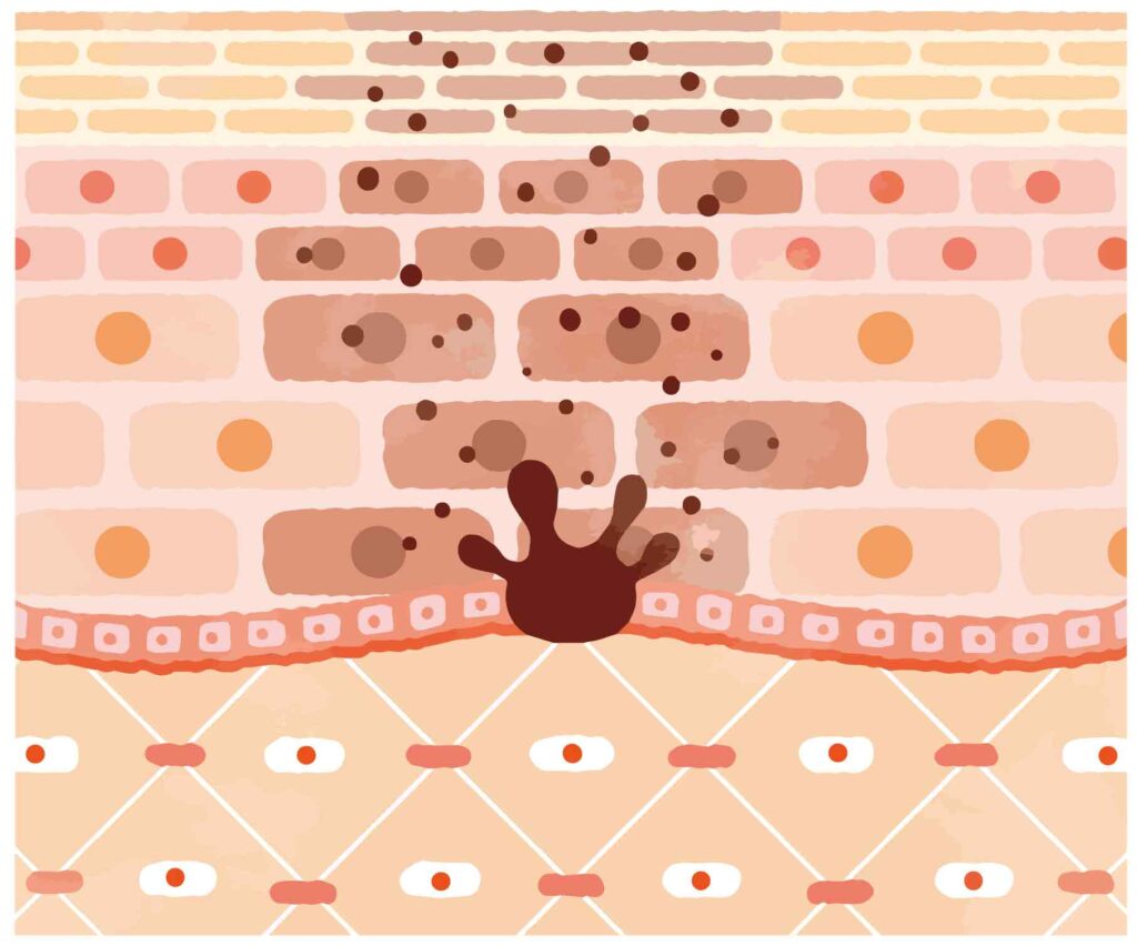 Enlarged rete pegs with excessive accumulation of melanosomes leading to darker aging spots revealed by histomorphological measurements of internal structures of the epidermis (表皮内部構造の組織形態学的な測定で明らかとなった濃いシミ部位での表皮突起への過剰なメラノソーム蓄積)