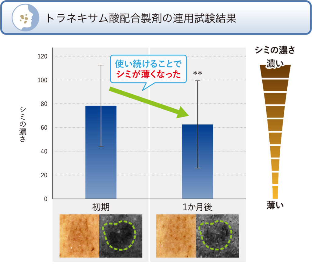 試験方法:29-55歳の頬にシミを有する日本人男性10名を被験者とした。連用試験期間中は、日焼けを避けながらトラネキサム酸を配合したクリームを1日2回シミ部位に塗布した。クリームはトラネキサム酸(有効量)、乳化剤(10%)、液状油・固形油(30%)、保湿剤(10%)、香料(微量)、精製水(残部)からなるものを使用した。なお、本試験はヘルシンキ宣言に基づく倫理的原則を遵守し、実施された。Mexa meter MX 18 (Courage + Khazaka Electronic GmbH, Germany)にてメラニン量を測定し、露光部である頬部から非露光部である上腕内側部のデータを引いた値(⊿Melanin index)をシミの濃さとした。
