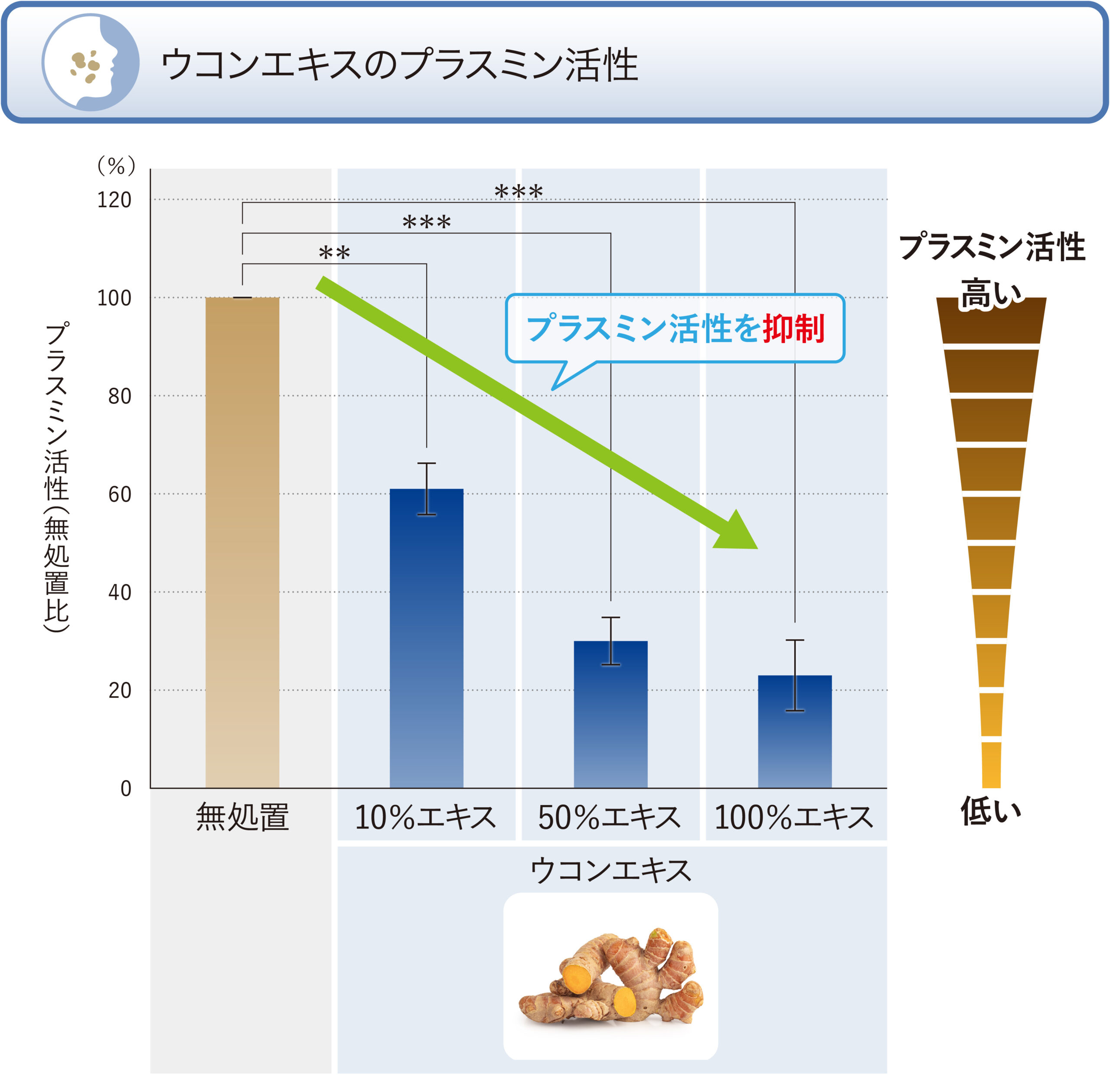 4. オウゴンエキス・ウコンエキスはプラスミン活性を抑え、シミ予防効果を発揮することを確認