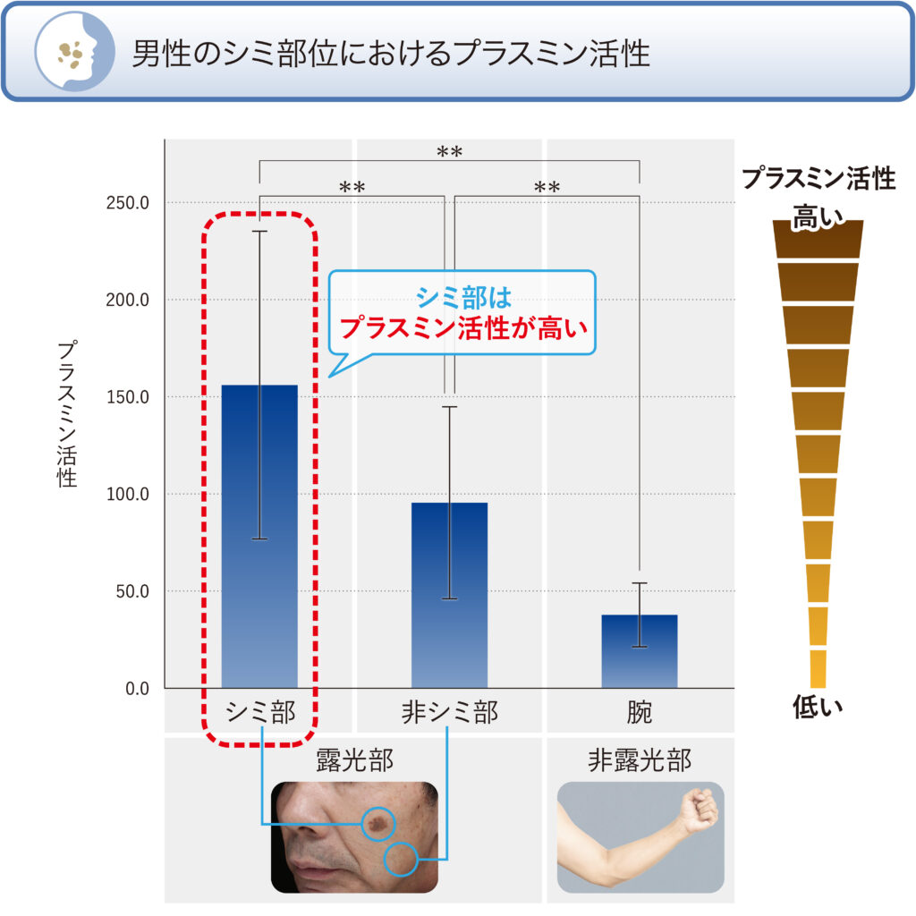 シミがある男性の頬および腕から角層を採取し、シミ部位の角層内に含まれている炎症性物質プラスミンの活性を測定しました。また、女性のシミ部のプラスミン活性と比較するとともに、シミの濃さとプラスミン活性に相関関係があるかどうかを確認しました。