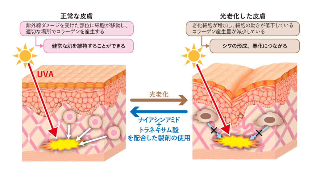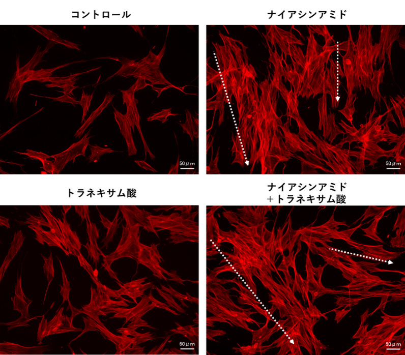 ナイアシンアミドやトラネキサム酸などのアンチエイジング成分は、シミやシワなどの光老化を防ぐために開発されてきました。しかし、その研究の多くはコラーゲンなどの代表的なタンパク質の産生量の変化やヒトの見た目に着目したものであり、組織の恒常性維持に重要な、細胞の形態や動きに着目した研究はほとんどありませんでした。