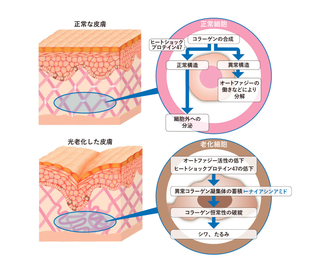 本研究で老化した線維芽細胞では正常な構造を形成できなかったコラーゲンの凝集体が蓄積することが明らかとなりました。従来、加齢に伴い肌のコラーゲン量が減少することが知られており、その原因はコラーゲン合成能の低下と考えられていました。しかし、今回の研究結果から加齢などにより老化細胞が増加し、正常なコラーゲンが分泌されないことも肌のコラーゲン量低下につながっていることが考えられました。また、本研究により、これまでコラーゲンの合成を高めることが知られていたナイアシンアミドに、異常なコラーゲンを除去する新たな作用を見出すとともに、その作用メカニズムとしてオートファジーの活性化が示唆されました。この発見はナイアシンアミドのシワ予防・改善効果を高めるための新たなメカニズムを示唆しています。