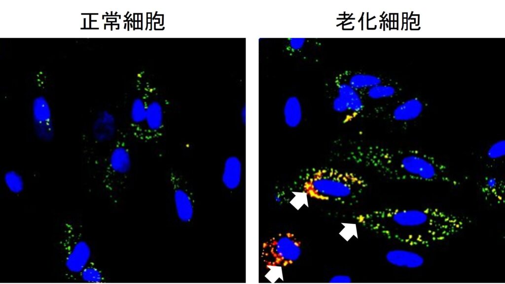 コラーゲンを産生する線維芽細胞を老化させたのち、細胞内のコラーゲン凝集体を免疫染色法で検出し、正常な細胞と比較しました。