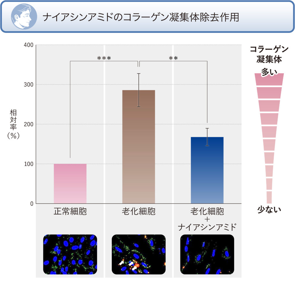 - ナイアシンアミドが老化細胞に作用し、この異常なコラーゲンを除去することを明らかにしました。