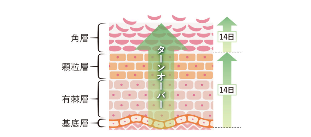 角層は皮膚の最外層にあるため、ダメージを受けて機能が低下しやすい部分です。そのため、「表皮ターンオーバー」によって常に新しい細胞と入れ替わっています。