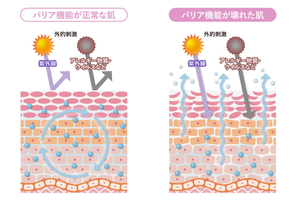 バリア機能が弱まると、肌内部の水分が蒸発しやすくなり(乾燥肌)、外部からの刺激にも敏感になって炎症を起こしやすくなります。
